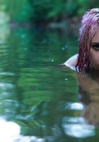 Татуированная девушка с окрашенными волосами во время прогулки по природе нашла лесную реку с небольшой глубиной и вошла в нее, не побоявшись намочить черное платьице. Немного искупавшись в одежде, Веном сняла ее со своего роскошного тела и продолжила плескаться в чистой воде голышом, не пряча свою попку и молочные железы.