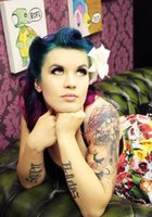 Полноватая Себьен с крашенными в необычные цвета волосами залезла на диван болотного цвета и стала принимать вызывающие позы, постепенно снимая с себя черную тунику. Вскоре баловница окончательно оголилась и стала становиться так, чтобы были отлично видны ее молочные железы и другие интимные части татуированного цвета.